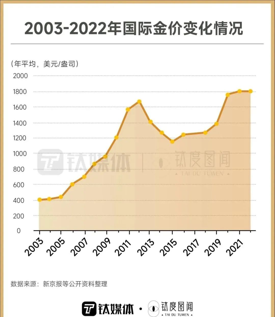 与此同时,国际金价也一路波动上涨。2003年,国际金价为403美元/盎司,到2022年,国际金价飙升至1800.13元/盎司。20年间,国际金价涨幅达346.68%。