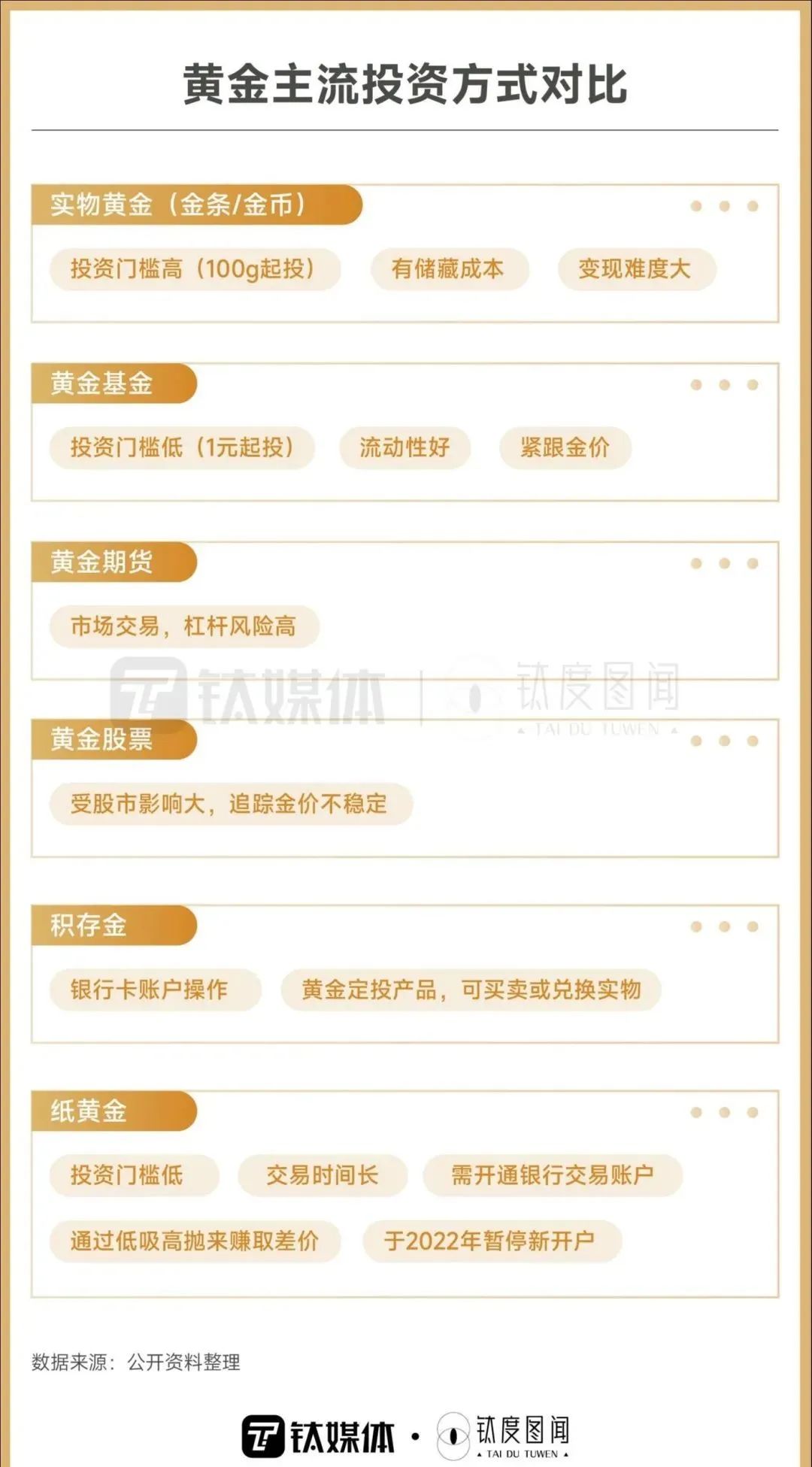 而对于黄金期货和黄金股票,黄金期货交易杠杆风险大,黄金股票受股市的影响更大,追踪金价的能力不稳定,它们更适合专业人士投资。