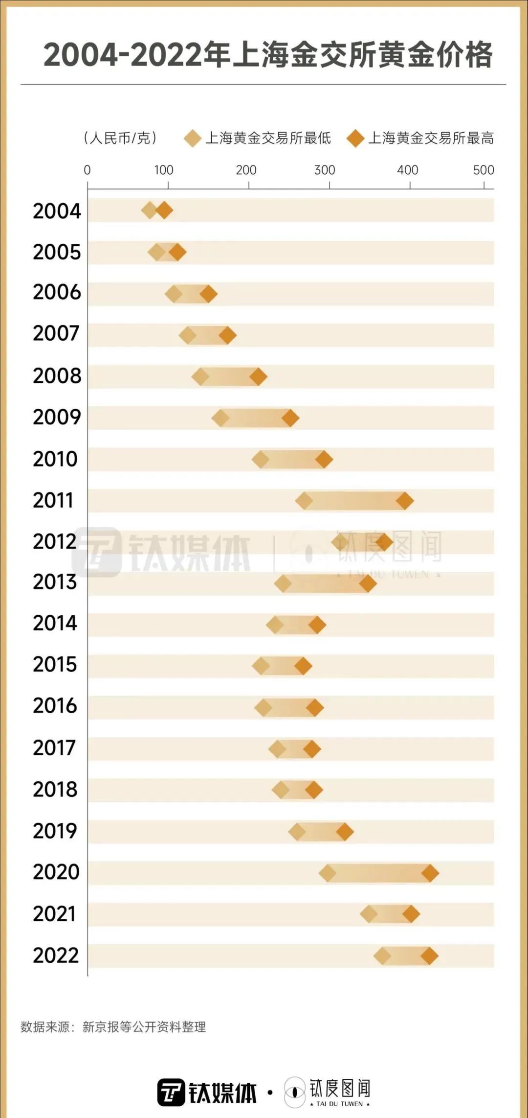 钛媒体·钛度图闻通过整理发现,中国黄金价格在20年的时间里涨幅达379%,从2004年的最低价格75.9元/克上涨到2022年的363.6元/克,但这20年间金价并非单边单线上涨,而是有回调下跌的情况。
