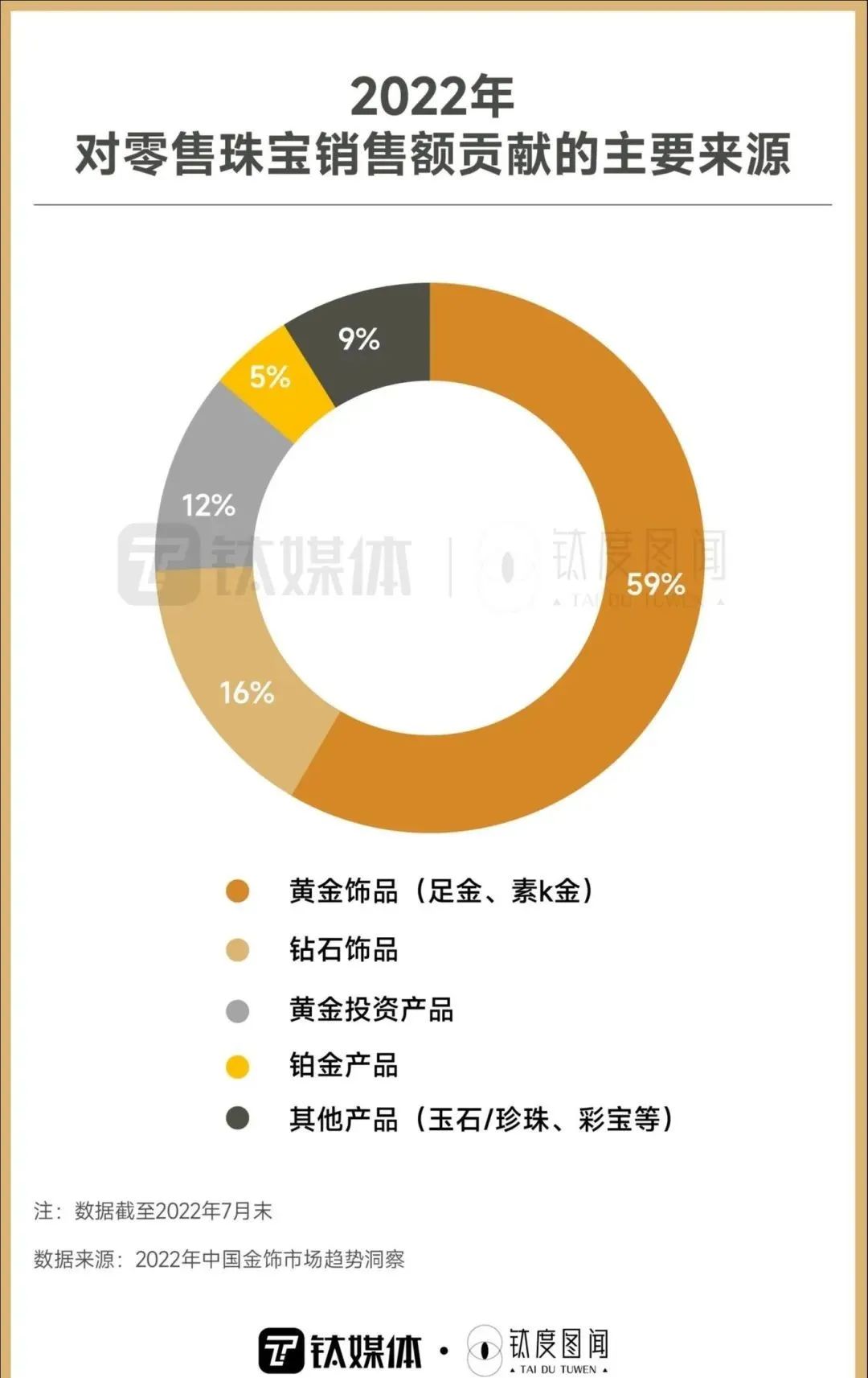 在中国零售珠宝市场中,与其他品类相比,金饰和投资类黄金产品日益受到消费者欢迎。2022年前7个月,黄金产品对珠宝销售额的贡献最大,其中,黄金饰品占比最大,为59%,因此,黄金饰品是中国零售珠宝市场中最重要的珠宝类别。