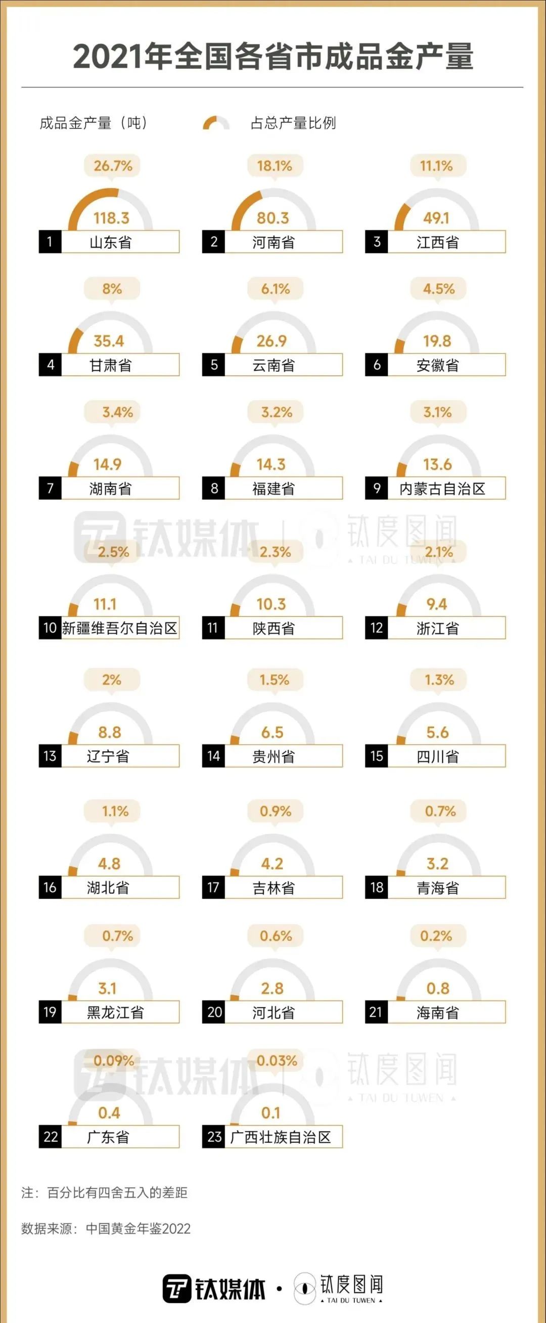 但国内产金地区高度集中,前10名省市生产了全国86.7%的成品金产量,即1/3的省市生产了占全国近9成的成品金产量。