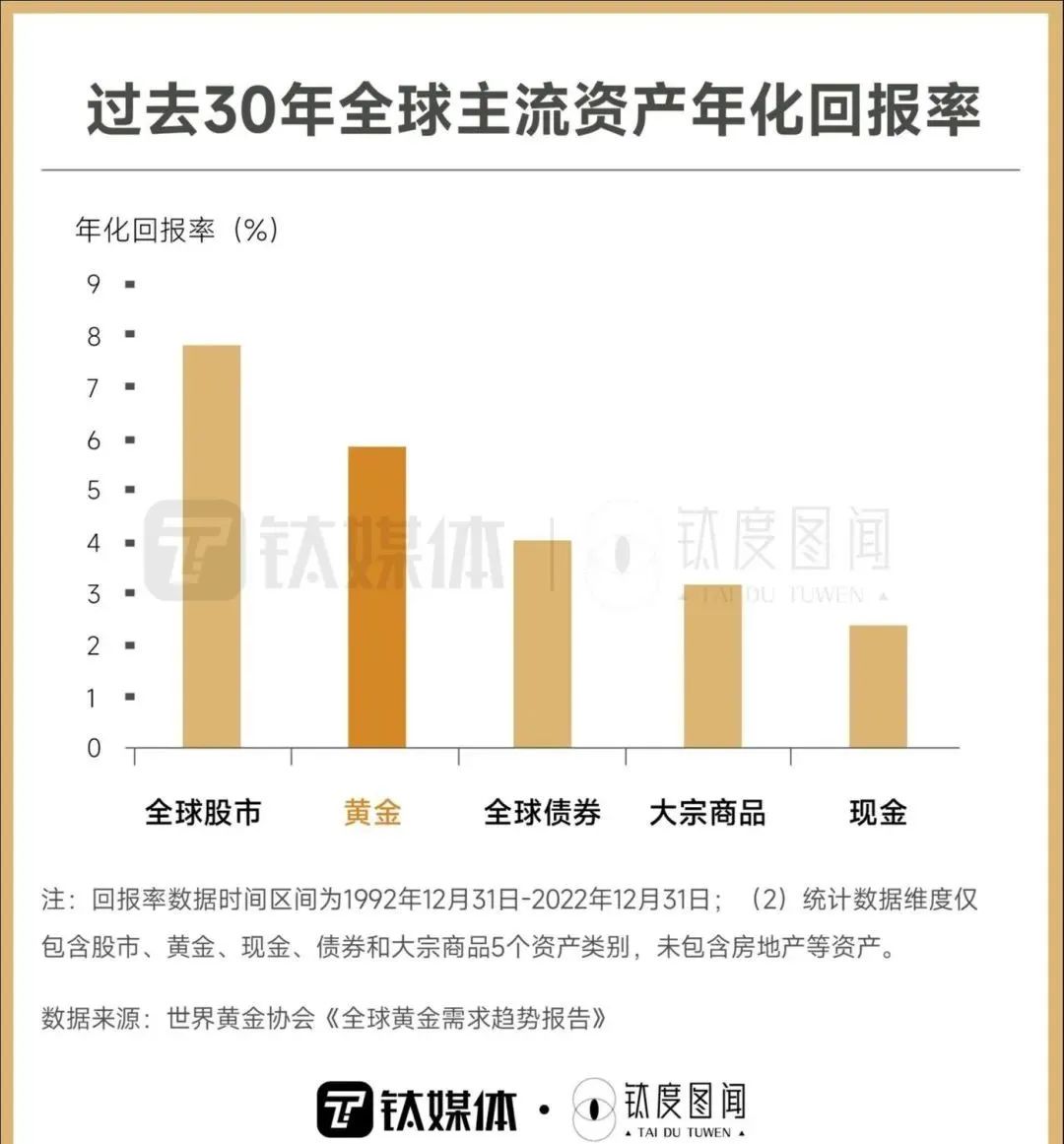 世界黄金协会报告统计了30年来全球股市、黄金、现金、债券和大宗商品这五个全球主流资产的年化回报率,从收益率来看,黄金的年化回报率为5.8%,超过了现金、债券和大宗商品等全球主流资产的同期表现。