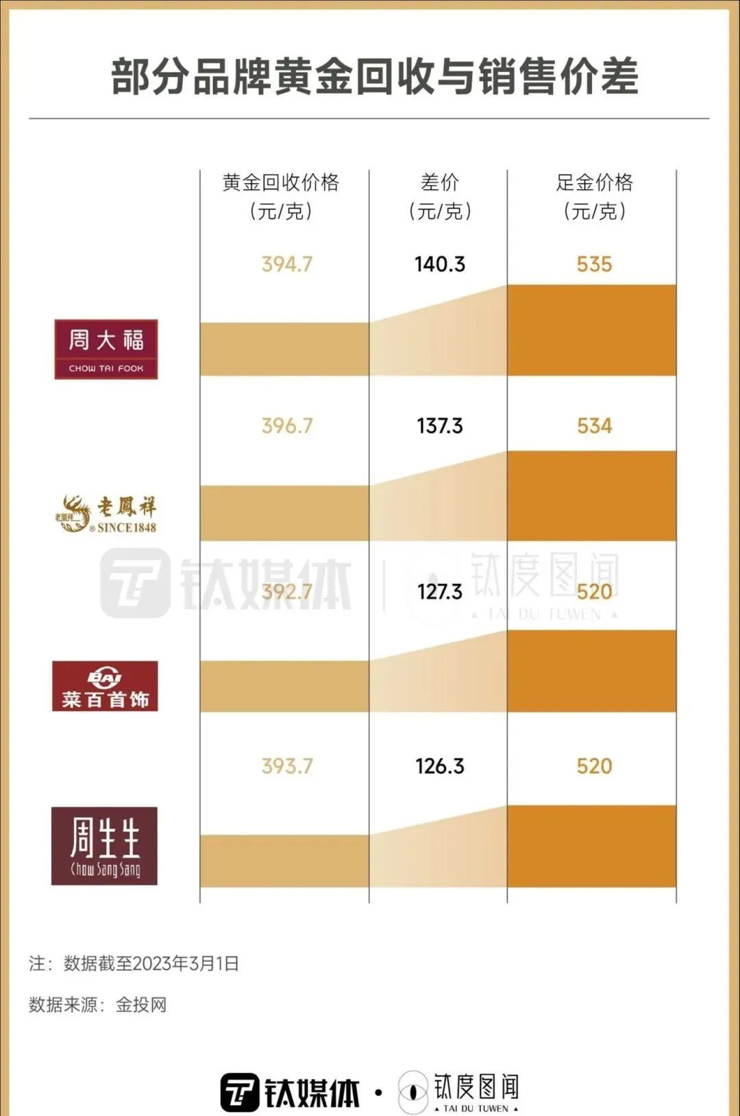 从收益来看,黄金产品确实是一个好的投资。但如果从保值和增值角度考虑,购买黄金首饰并不是首选,因为黄金首饰不仅包含了黄金价格成本,还包括了首饰加工费及品牌、设计等的溢价;在黄金饰品卖出时,还会有一定的交易成本。据钛媒体·钛度图闻不完全统计,部分品牌黄金回收与销售价差均在100元以上。