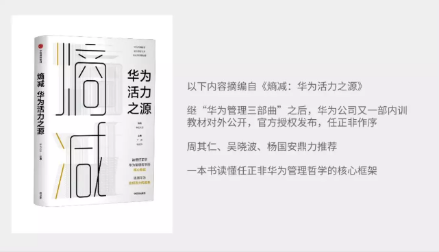 华为的发展不是偶然的, 任正非开创性的管理思想和战略起着决定性的作用。 华为之所以不易被人理解,一个重大原因就是任正非的管理思想,其源头上摆脱了商学院式的理论框架,仿佛黄河源头的九曲十八弯,既有观察现实世界、不断实践的人性感悟,也有横贯东西方的科学和哲学洞察。 如何进行熵减、保持活力? 本期,我们将推荐《熵减:华为活力之源》一书。在本期「创创荐书」中,通过阅读这本书,读者不仅可以无限贴近任正非华为管理思想的核心理念,从而获得激发自身组织及员工活力的方法,更可以从中窥见华为组织活力的一斑。