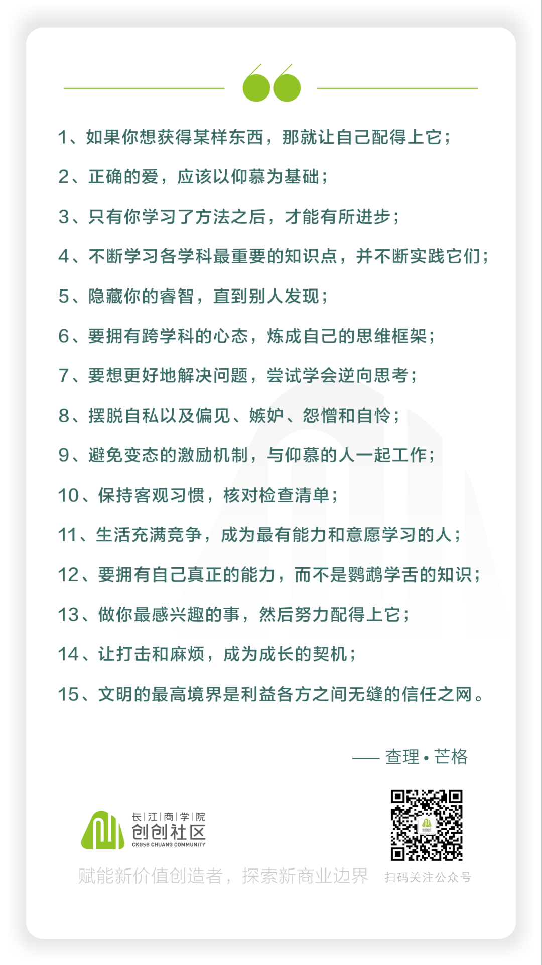分享查理 • 芒格在美国南加州大学毕业典礼上的演讲。在这场演讲中,查理 • 芒格给年轻人分享了对他人生有重要影响的15条建议。