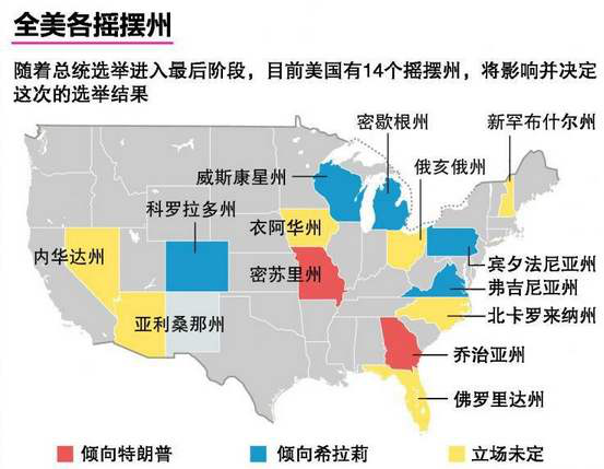 比如美国总统竞选,候选人为了获得全国性的胜利,会把竞选计划分解到每个州,然后将重点放在几个决定大选结果的“关键摇摆州”,也就是那些竞选双方势均力敌,都无明显优势的州上。