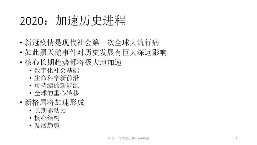 首先,历史进程在加速,新冠疫情是现代社会第一次全球规模的疫情。比尔盖茨先生写了一篇文章,他分析了为什么新冠疫情会带来一个全新的格局。文章的核心是参考黑天鹅事件对历史所造成的巨大影响,黑天鹅事件发生的概率很小,但是对世界影响很大。它的直接影响是,目前已经在发生的几个核心历史潮流都被大幅加速了,原本可能要五年、十年以后才会发生的事情,因为疫情的原因,时间被缩短了,有的现在就开始发生了。