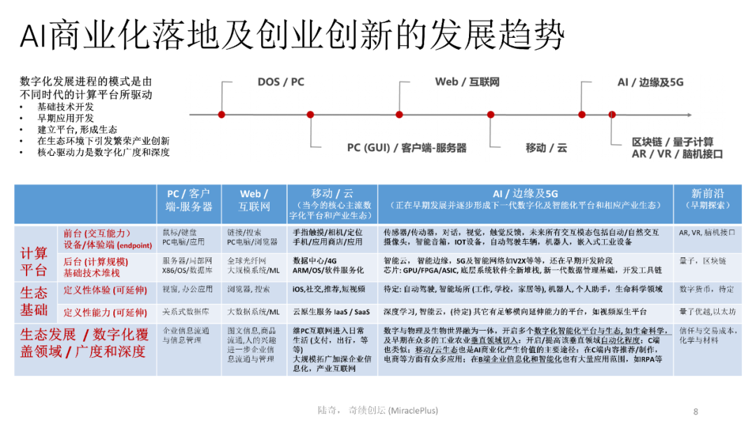 数字化的进展由平台驱动,任何新的平台一开始起来,早期创业公司和大公司基本都是做基础技术的开发。今天AI很多创业公司都是在开发基础技术,包括芯片、传感器等。