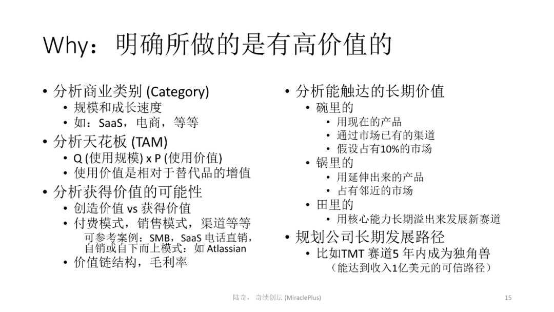 所以大家核心做的验证是第一能否赚钱,尽可能找数据、案例验证,第二,开始满足客户的需求,比如原来用户要花一个小时,现在只需要五分钟,以前没有满足的或者以前被满足不好的需求,现在被满足了。第三,一定要看得见增长,如果看不见增长,大概率上是你产品没有做好,或者产品做好市场没切对,或者是伪需求。