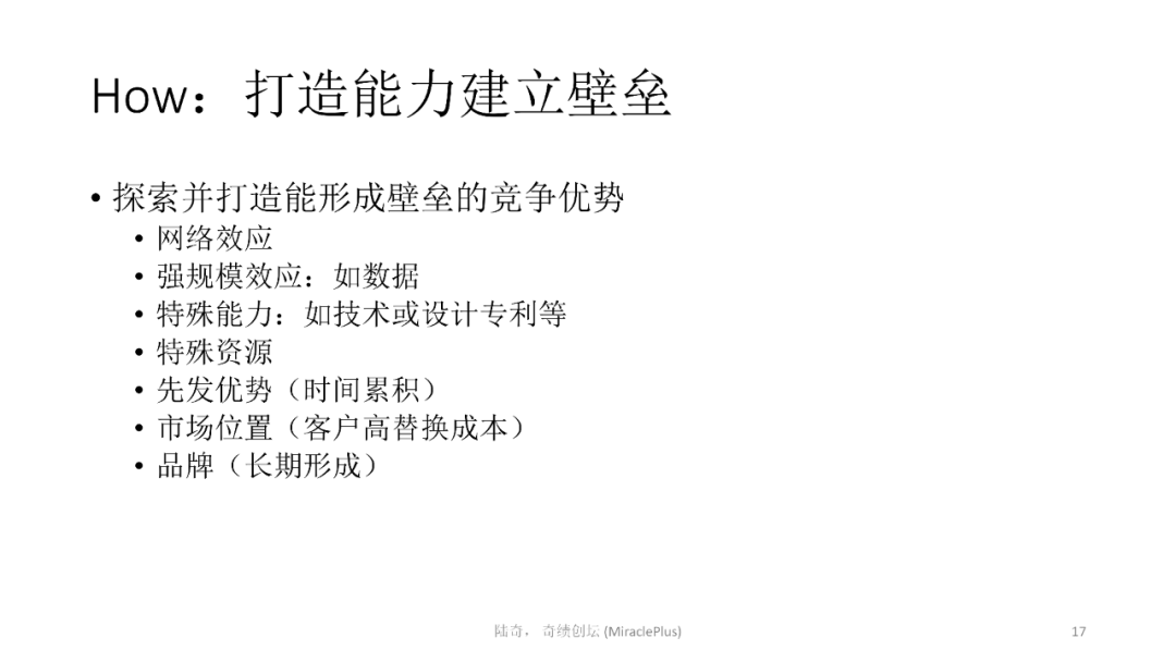 下面说一下如何打造壁垒。创业者经常被投资人问:你到底有什么样的能力可以形成壁垒?大厂进来竞争,你怎么办?每位创业者都需要思考这个问题,我们总结了几种常见壁垒: