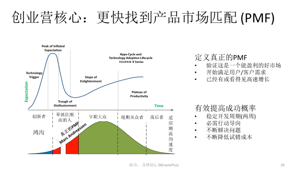 第一件事情是帮助每个创业团队更快地找到产品市场匹配(PMF),在创业早期,这是非确定性最大、风险最高,但是价值提升最高的一环。