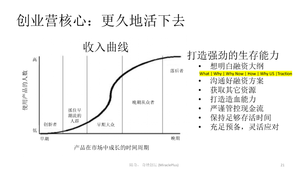 任何一个企业都是这样,早期要活下来基本靠融资,早期基本是靠人,核心是想明白融资大纲,就是刚才讲的这五点(what/why/how/why us/why now)加上进展,你想清楚,跟投资者沟通清楚,比如为什么要这笔钱?这笔钱怎么用?有这笔钱公司如何走向下一个阶段。除了融资造血,有时候还要打造造血能力,或者其它的能力。