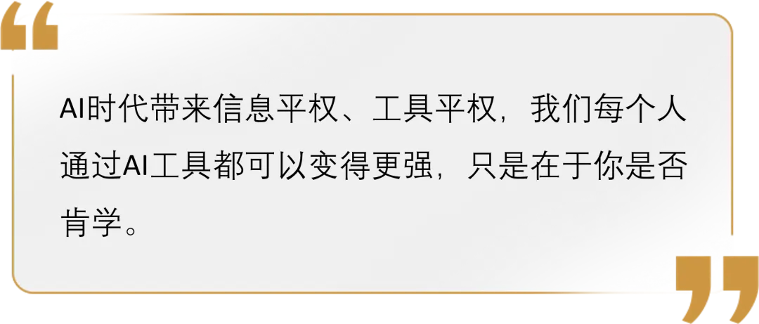 “AI时代带来信息平权、工具平权,我们每个人通过AI工具都可以变得更强,只是在于你是否肯学。”