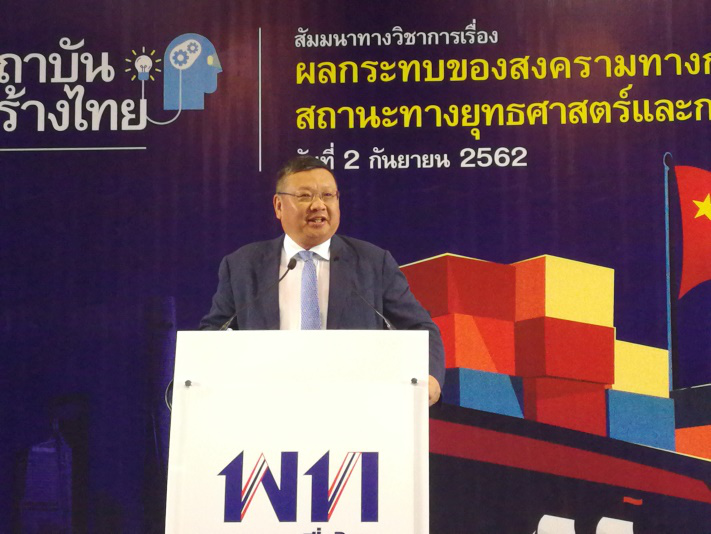 泰国著名女政治家、为泰党选举战略委员会主席素达拉·革育拉攀夫人(Sudarat Keyuraphan)发表开幕致辞。她表示,美国、中国是泰国重要的出口市场,泰国与美国、中国的贸易额巨大。泰国经济发展的不平衡和社会差距,可能是导致危机的风险所在,会影响国家经济的稳定,泰国民众应该清楚这个问题和做好应对准备。为应对此次美中贸易战的政策和措施,需了解中国的贸易政策,认清中国经济正对世界经济和东盟经济发挥重要作用的事实。为泰党作为泰国第一大党,更应意识到问题的重要性,通过此次研讨会,能了解到问题所在,为未来制定国家政策做好准备。