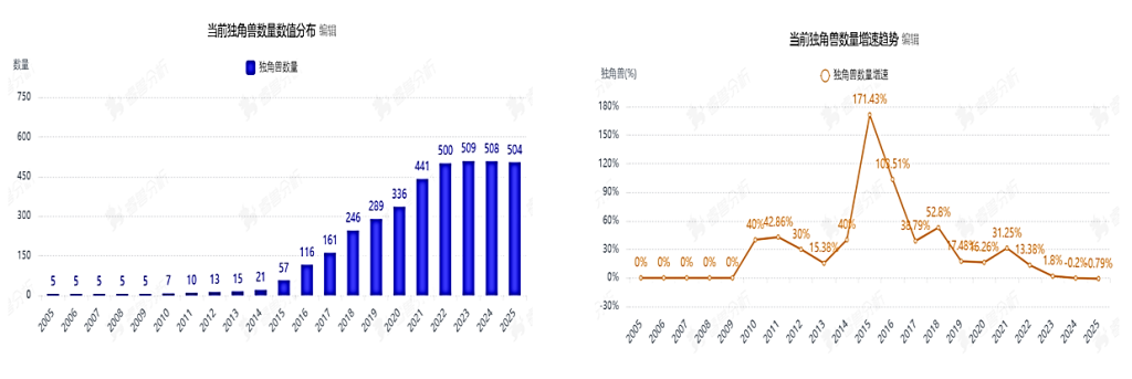 根据睿兽分析数据库,截至10月10日,2025年中国独角兽企业数量504家,中国独角兽的增速高峰在2014-2018年期间,但随着互联网红利逐渐见顶、资本市场监管趋严等多重因素叠加,市场进入理性调整期,到了2025年10月增速仅为-0.79%(图 1)。