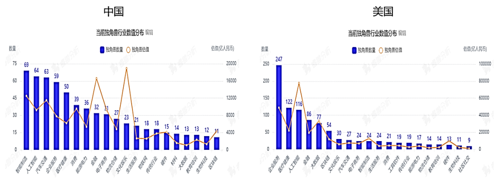 图 3 中美独角兽行业分布情况(截至2025年10月10日)数据来源:睿兽分析