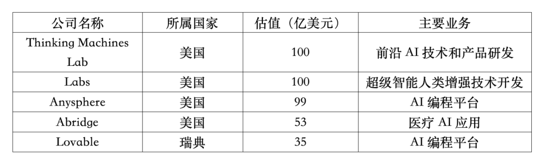 早期的AI投资主要聚焦于“AI+行业”的赋能逻辑,投资人关注的是如何用AI改造现有业务流程。但2024年后,投资逻辑发生了根本性转变。资本开始追逐那些只有AI才能创造的全新价值——如ThinkinMachinesLab(由前OpenAI首席技术官MiraMurati联合创立)在未推出任何产品的情况下以120亿美元估值完成20亿美元种子轮融资,这在传统创投逻辑中几乎不可想象(表1)。