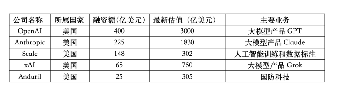 超级独角兽的崛起是本轮AI投资集中化最直观的体现。在近一年来相继完成巨额融资之后,全球估值前十的独角兽之中,已经有四家AI企业(大模型开发商OpenAI、Anthropic和xAI,数据智能和AI平台服务商Databricks)。这些企业的核心价值在于它们对算力、算法和模型的掌握,它们代表了当前市场对于AGI(通用人工智能)潜力的最高定价(表2)。