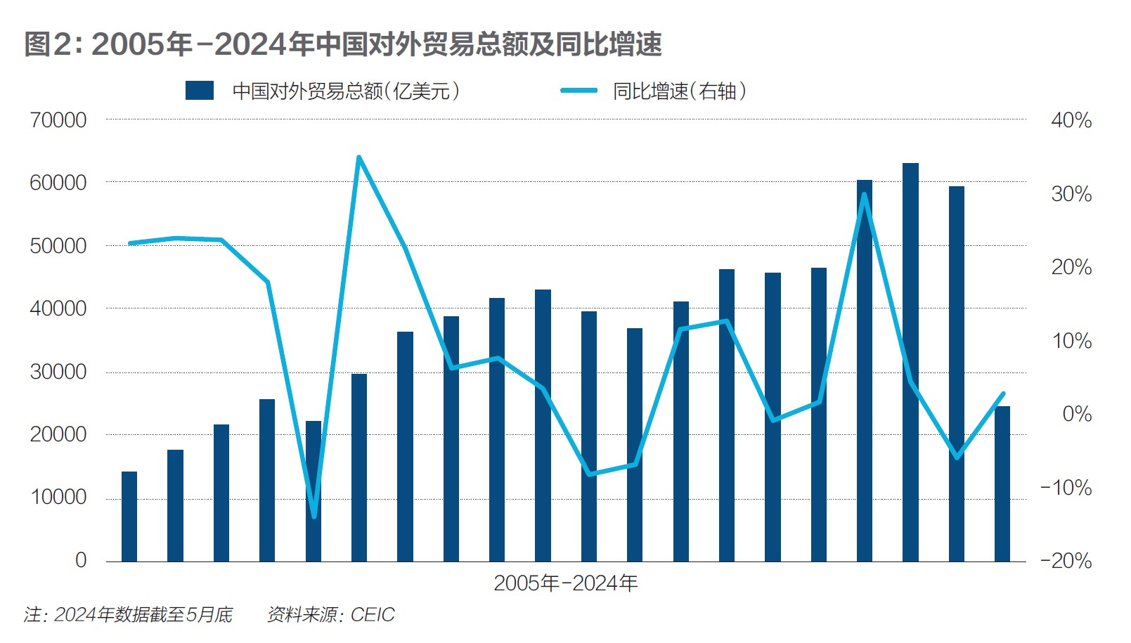 图2是2005年至2024年中国对外贸易总额及同比增速。2018年,中美贸易战爆发,但中国对外贸易保持增长。2019年,受贸易战影响,中国贸易总额下降0.96%。2020年,新冠疫情暴发,全球贸易规模下降,中国贸易总额虽然是同比增长的,但涨幅(1.70%)低于2017年(11.44%)、2018年(12.55%)。在2021年、2022年,中国对疫情的控制比其他国家要好,且拥有相对完整的供应链,因而中国出口规模大增。2021年贸易总额同比增长29.81%,2022年相比2021年的高基数也增长了4.40%。2023年,受全球整体贸易规模下降和贸易摩擦日益增多的影响,中国贸易总额同比下降5.91%,略低于2021年水平,与2017年相比还是增长了44.55%。2024年1月-5月,贸易总额2.46万亿美元,同比增长2.77%。