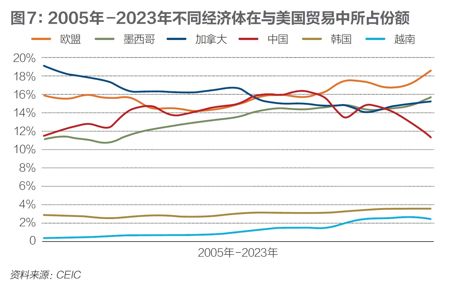 图7是2005年至2023年不同经济体在与美国贸易中所占比例。从2017年到2023年,中国在与美国贸易中所占份额降低5.07%,而欧盟、墨西哥、越南、韩国、加拿大在与美国贸易中所占份额分别提高2.87%、1.34%、1.03%、0.47%、0.20%。