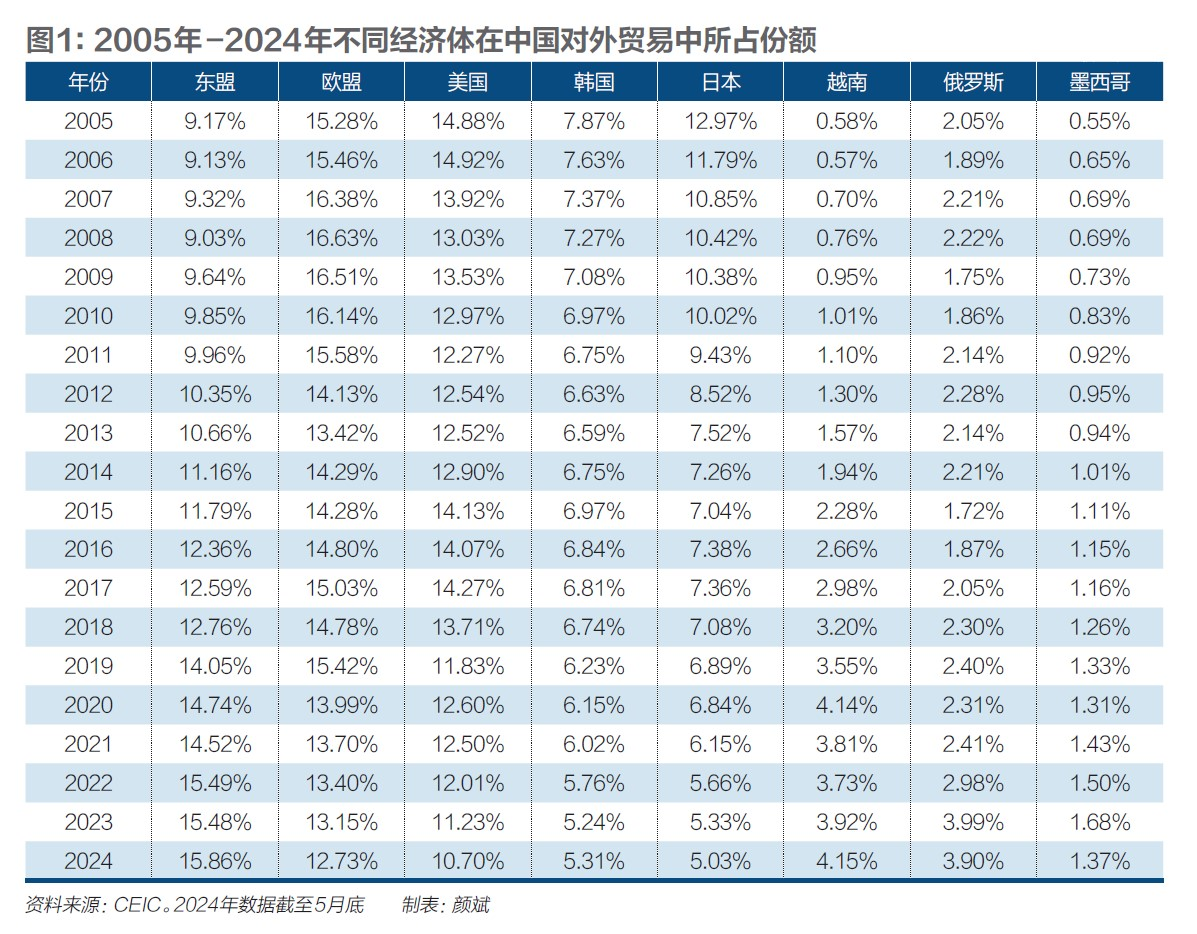 2018年中美贸易战爆发后,两国之间的关税上升和贸易壁垒增加,中美之间的直接贸易量减少。但是,中国积极调整外贸策略,采取多种措施来缓解贸易战带来的压力,其中之一是调整贸易结构,加强与其他国家和周边地区的贸易合作,减少对美国的依赖,分散贸易风险并拓展新的市场空间。这体现在中国与美国的直接贸易额下降,在美欧日韩等主要贸易伙伴国中的贸易地位有所下降,与此同时中国与东盟(主要是越南)、墨西哥等新兴经济体的贸易量相对增加。