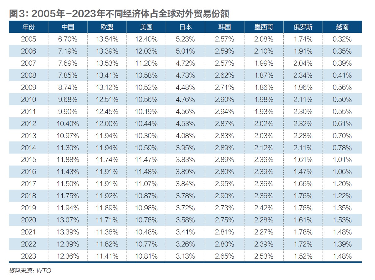 图3是2005年至2023年不同经济体占全球对外贸易份额。从占全球贸易份额来看,贸易战并没有阻滞中国的上升趋势。在2020年、2021年,由于新冠疫情影响,中国占全球贸易份额一度超过13%,2022年降到12.39%,而2023年与2022年持平。此外,越南、墨西哥等新兴市场所占份额在增长。从2017年到2023年,中国、越南、墨西哥占比分别提高了0.86%、0.29%、0.17%,而日本、欧盟、韩国、美国分别降低了0.71%、0.51%、0.29%、0.26%。