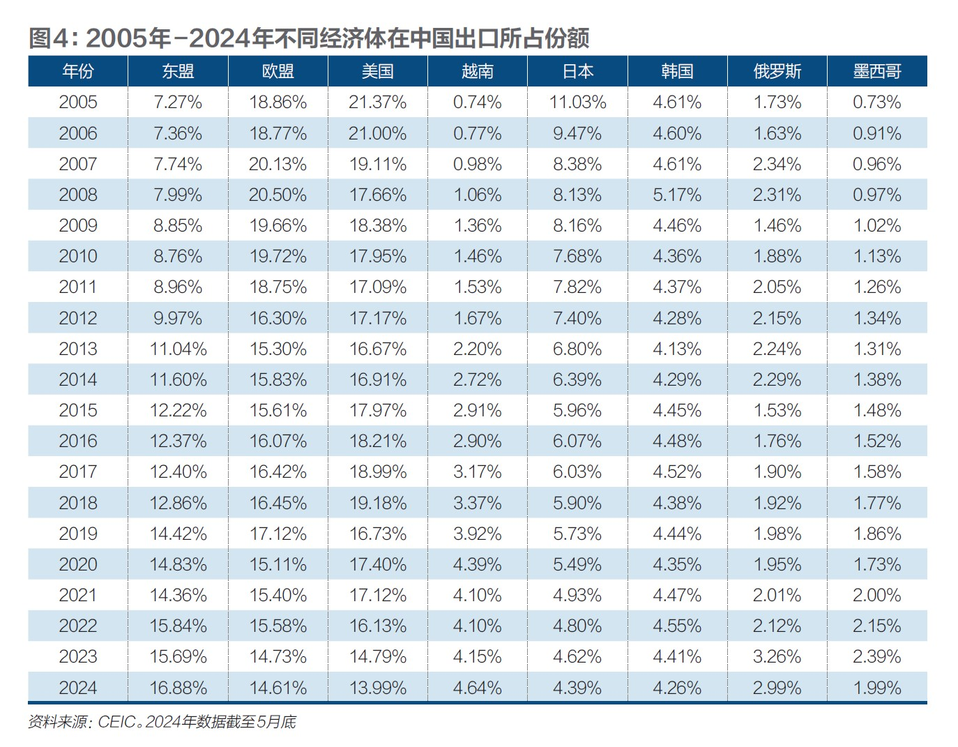 图4是2005年至2024年不同经济体在中国出口所占份额。2012年至2022年,美国都是中国出口最大目的地。2017年,美国占中国出口的18.99%;2018年,不少厂家为规避关税而突击出口,占比上升至19.18%;相应地,2019年,美国占中国出口份额下降到了16.73%。2020年至2022年,美国仍是中国出口最大目的地,但所占份额逐年下降。